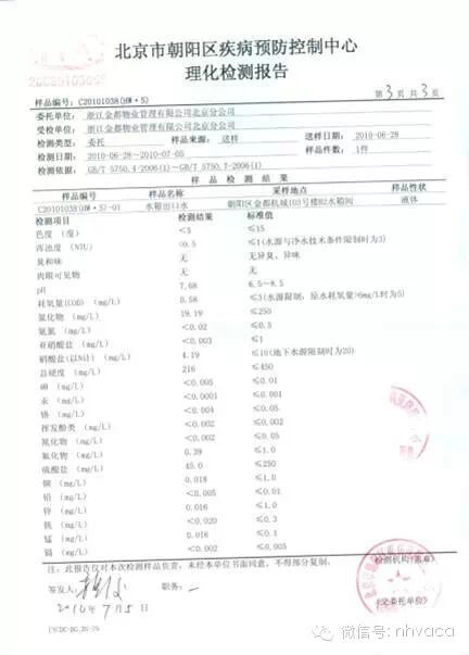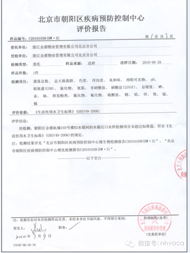 4、生活給水系統(tǒng)管道在交付使用前必須沖洗和消毒,并經(jīng)有關(guān)部門(mén)取樣檢驗(yàn),符合國(guó)家《生活飲用水標(biāo)準(zhǔn)》方可使用。檢驗(yàn)方法:檢查有關(guān)部門(mén)提供的檢測(cè)報(bào)告。區(qū)縣疾病預(yù)防控制中心現(xiàn)場(chǎng)取樣檢驗(yàn),并出檢測(cè)報(bào)告表1-4(如下圖)